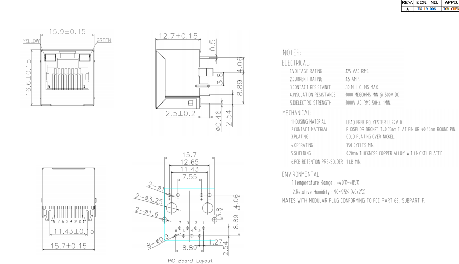 RJ45 8P8C Y&G WITH VERTICAL(RJ45 單PORT 180度 帶燈超薄高度12.9 成品)數(shù)據(jù)手冊(cè)PDF下載