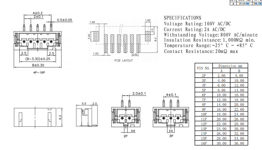 針座 1*2P 間距2.0mm 180度 貼片(立貼)數據手冊PDF下載