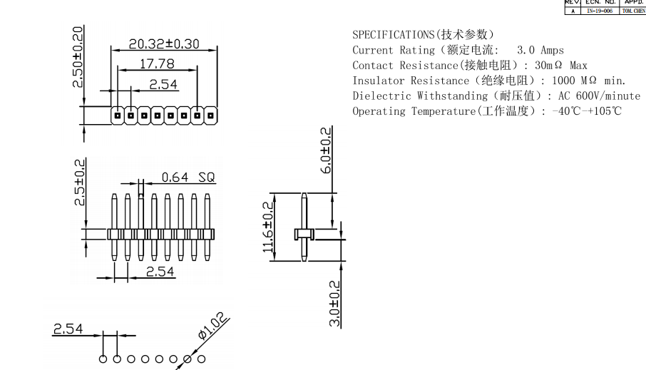 排針 單塑 1*8P 間距2.54mm 180度直針 6.0/2.54/3.0 (方針)數據手冊PDF下載