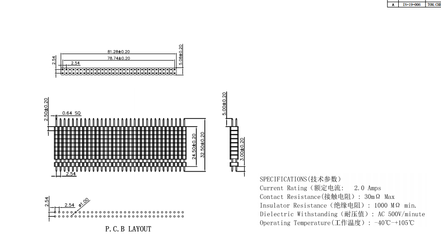 排針 2*32P 間距2.54mm 針高32.5mm 9連塑數據手冊PDF下載