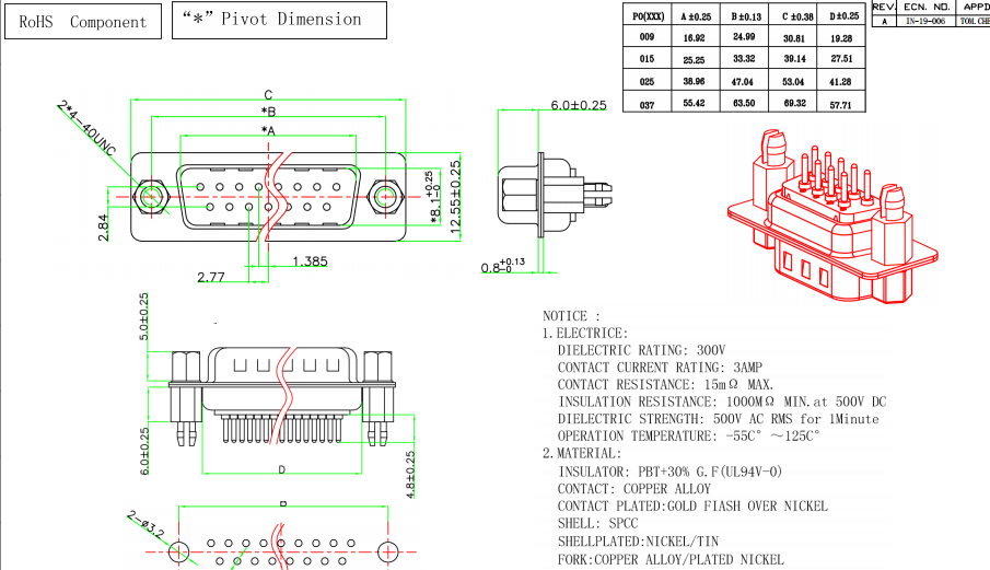 DP 9P 公 直插板鉚6.0魚叉鎖螺絲鐵殼前鎳后錫48H鍍金1u黑膠數據手冊PDF下載