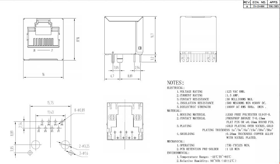 RJ45 Connector 1x1 Port 8P8C Without LED Vertical Module Jack(內定位柱)數據手冊PDF下載