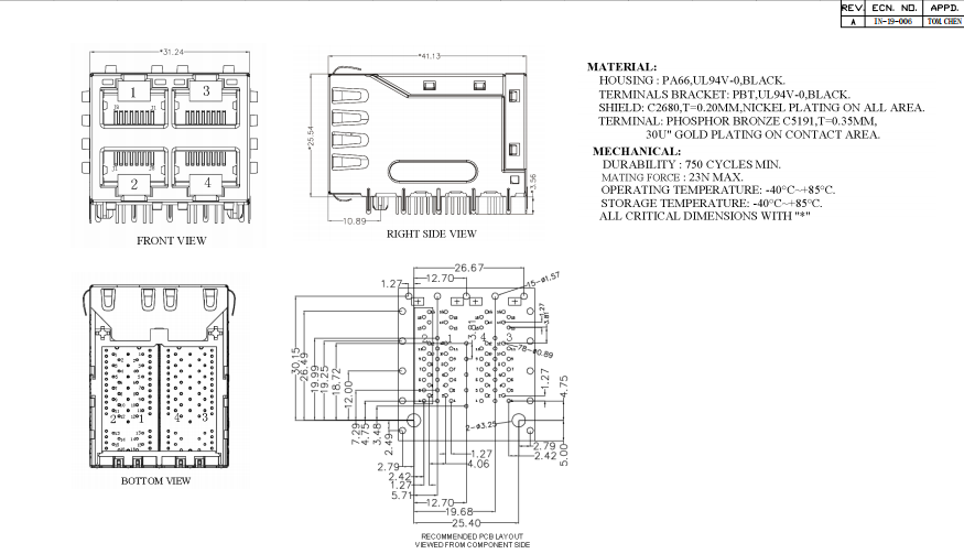 RJ45 帶網絡變壓器 2*2 90度 10G bast 帶彈片數據手冊PDF下載