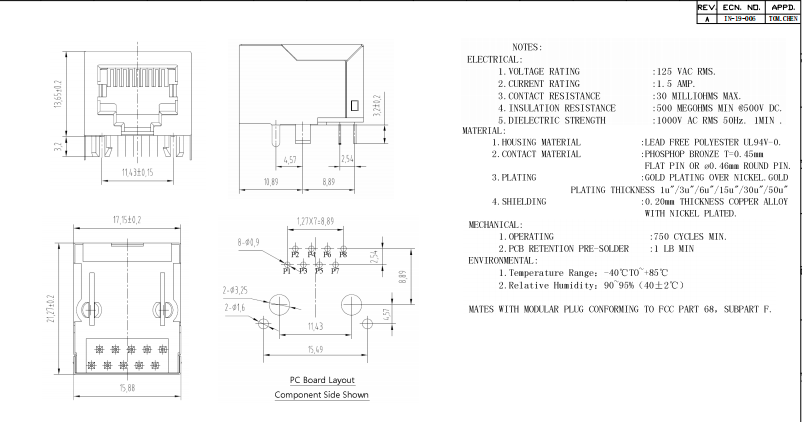 RJ45 Connector 1x1 Port 8P8CWithout LED Module Jack(無彈片)數據手冊PDF下載