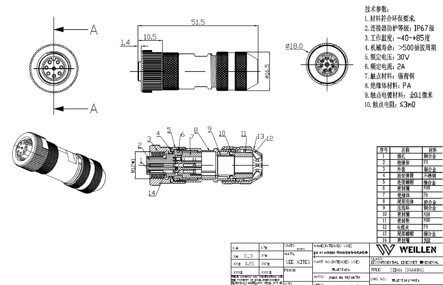 M12 8P A-CODING 母端壓接型組裝式連接器數據手冊PDF下載
